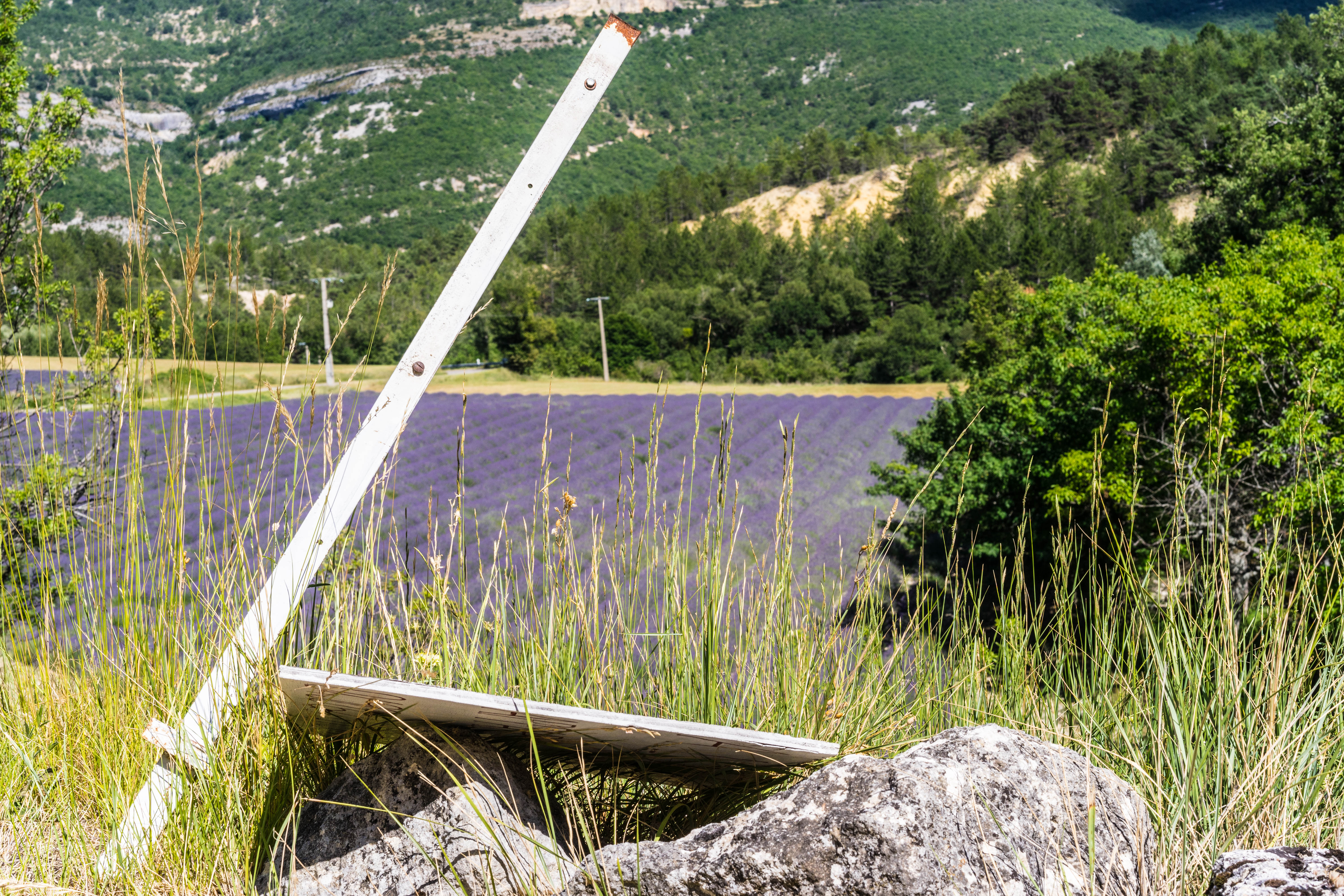 The young driver wanted to make a u-turn with his huge truck on a narrow road with lavender fields left and right. He succeeded, but at a cost (although not for him): he overturned a modest sign indicating rooms for rent.
