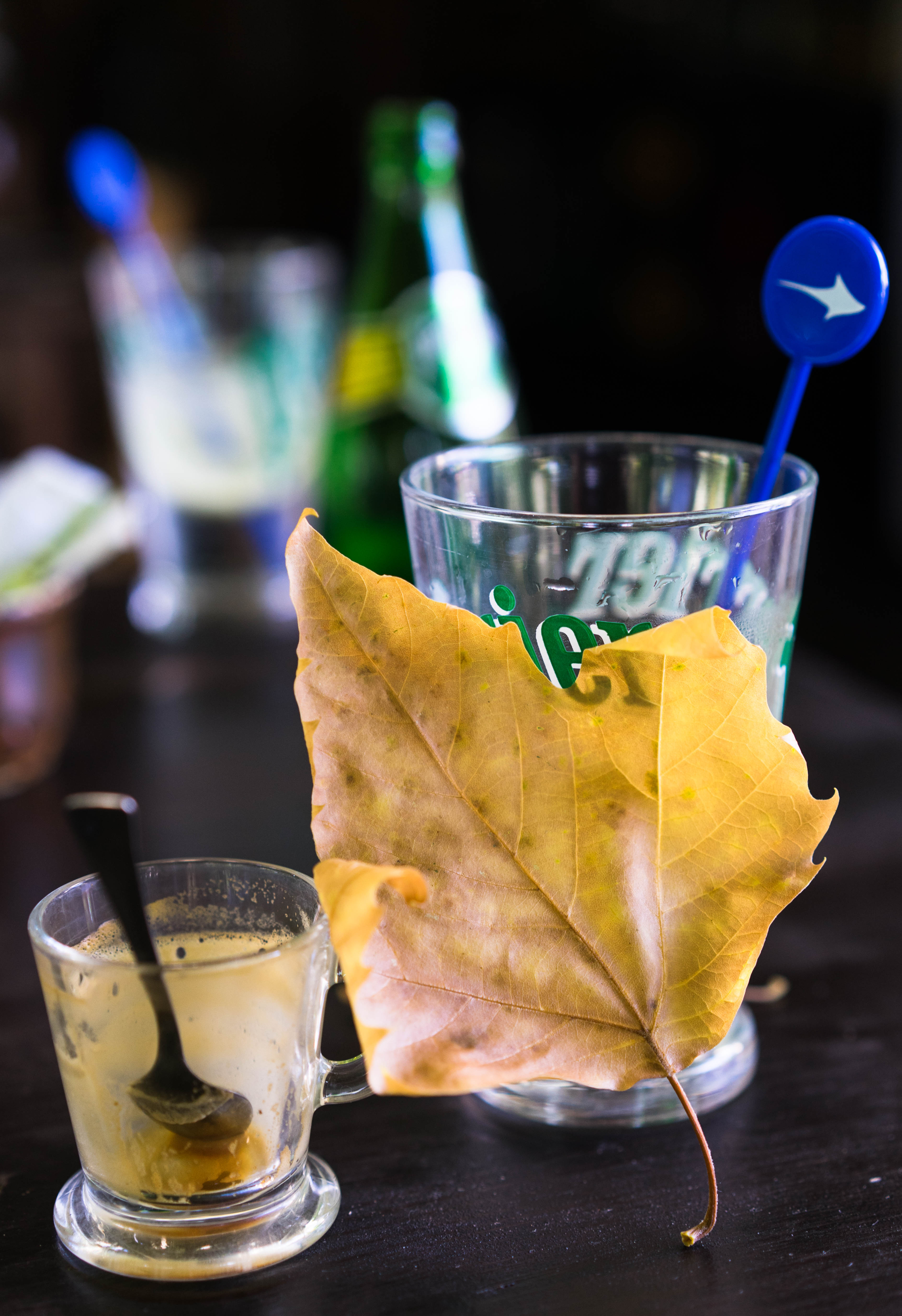 It was 10:15 in the morning and it was high time for a little coffee break. I was in a very small village, St Pantaléon-les-Vignes, but was happy to spot a nice-looking restaurant with a terrace under a huge plane tree. Very romantic and inviting. A young and smiling waitress was already setting the tables for lunch, but said that we could choose any table we liked. A moment later, however, appeared a stern lady barking “Sit there!” There was no dog in sight, so the order was aimed at us. My good mood vanished but I was almost (not quite though) ready to forgive her when a beautiful leaf sailed down and landed just in front of me.