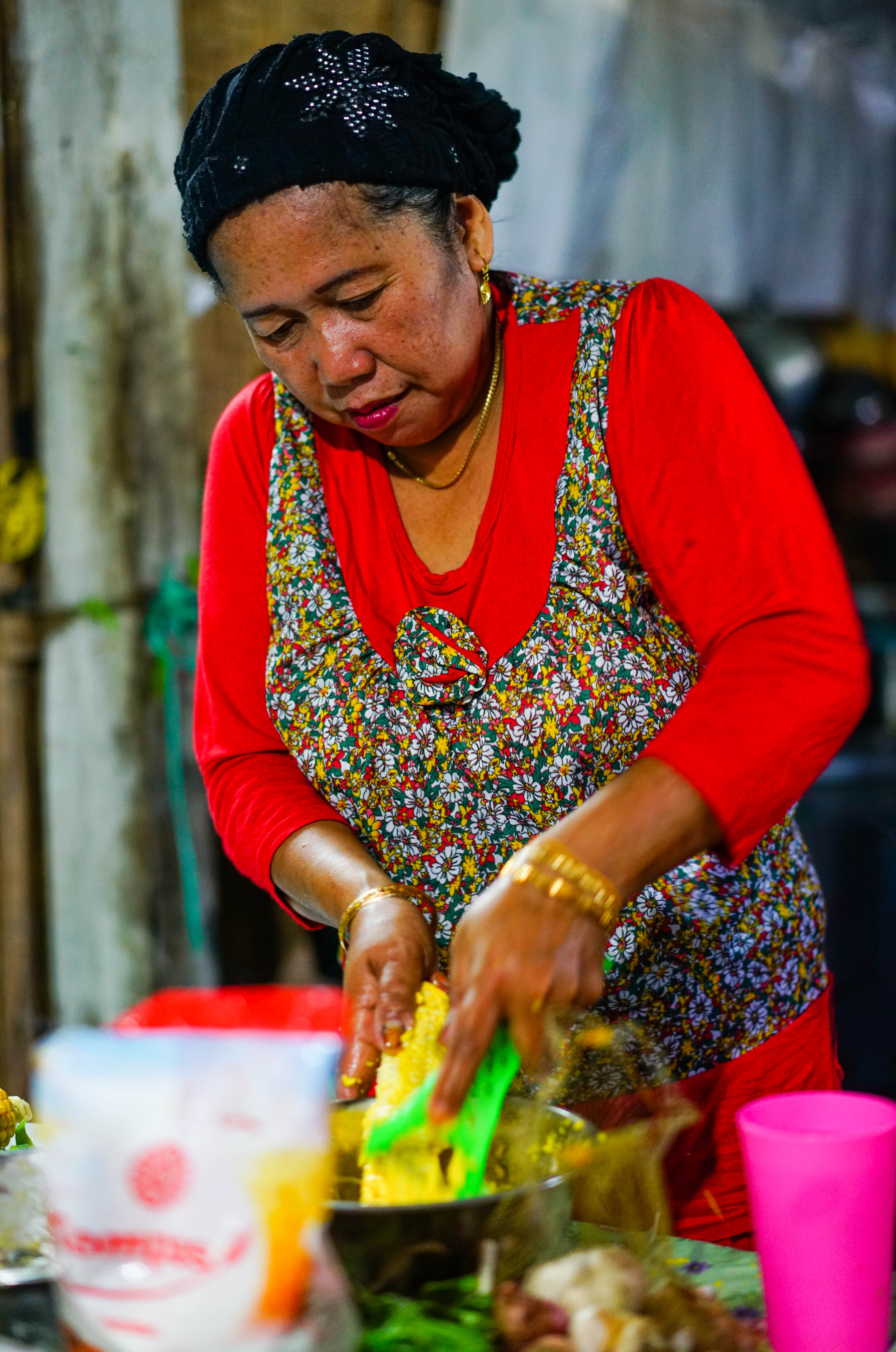 The guide had accompanied me to the fish market and the general market in the morning to make sure we had all the necessary ingredients. We had purchased tiny fish, a bigger fish, some corn on the cob, lots of chilli and small shallots, some kind of spring onion, a large number of bananas, just to mention a few ingredients. The fish was the first thing we bought in the morning, and I was a little concerned: would it cope in a warm plastic bag while we took a ride on a becak (three-wheeled cart, motordriven in this case) to the general market, strolled around the market under the scorching sun, took a rather long ride in a very crowded bus and rode on the ferry? Apparently it did, I suppose because it was really fresh. We all arrived safe and sound at our destination.