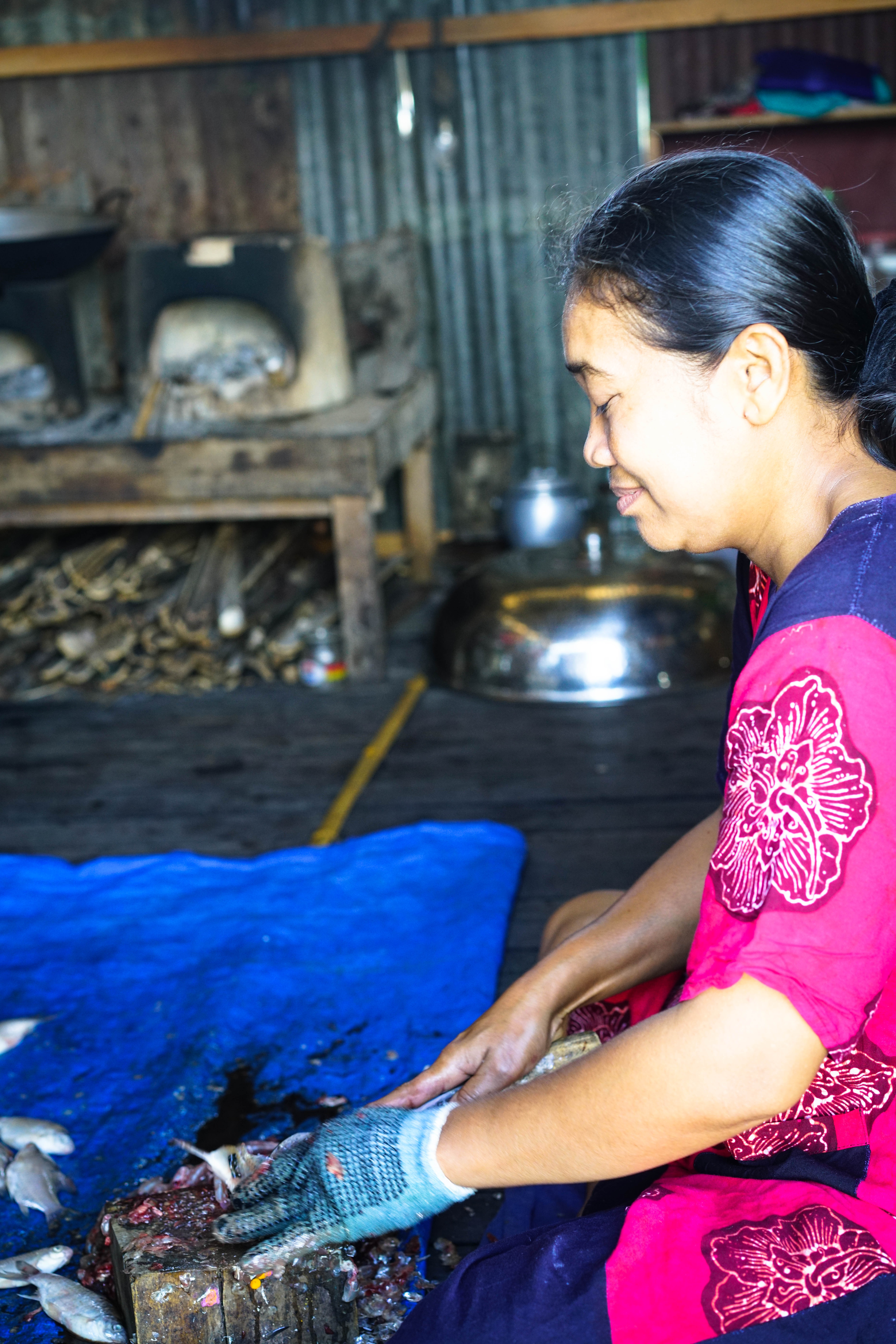 There was no furniture except a mattress that was propped up against the wall during the day and a neat kitchen with some shelves and a little stove. The lady of the house was busy with her daily chores of cleaning small fish and putting them out to dry, but interrupted her activity to prepare us some tea and delicious fried bananas. We sat chatting on a carpet as the house gently moved in the wind.