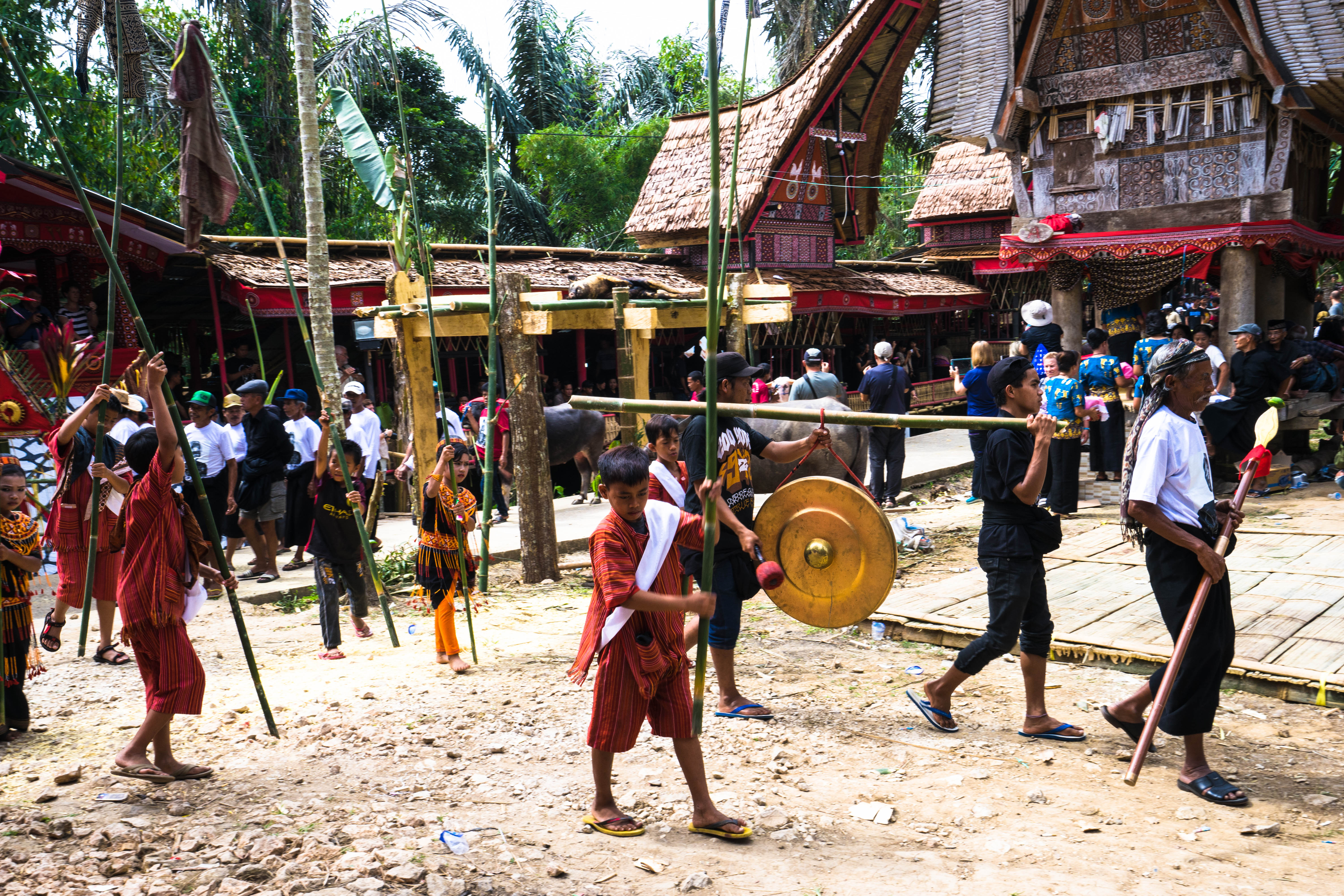 Ritual slaughter of numerous pigs is an essential part of the ceremony, and the slaughter of buffaloes the climax. Around midday lunch was served to all guests, mainly pork from the pigs that had been slaughtered on the spot. Not being a meat eater, I politely declined, although some very kind ladies really insisted and seemed to be seriously worried that I would walk around hungry and possibly unhappy. The lunch time was the calmest period of the day.