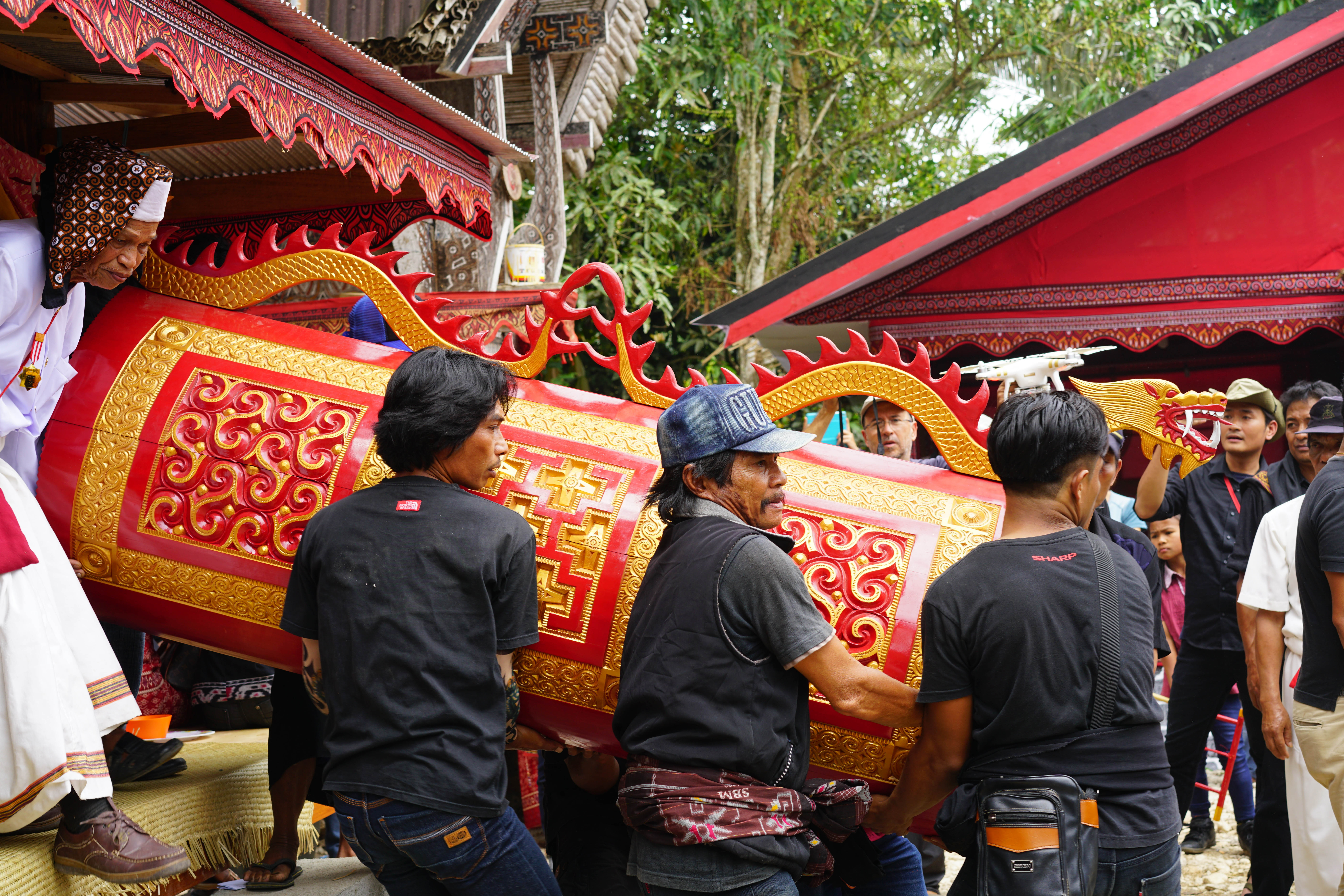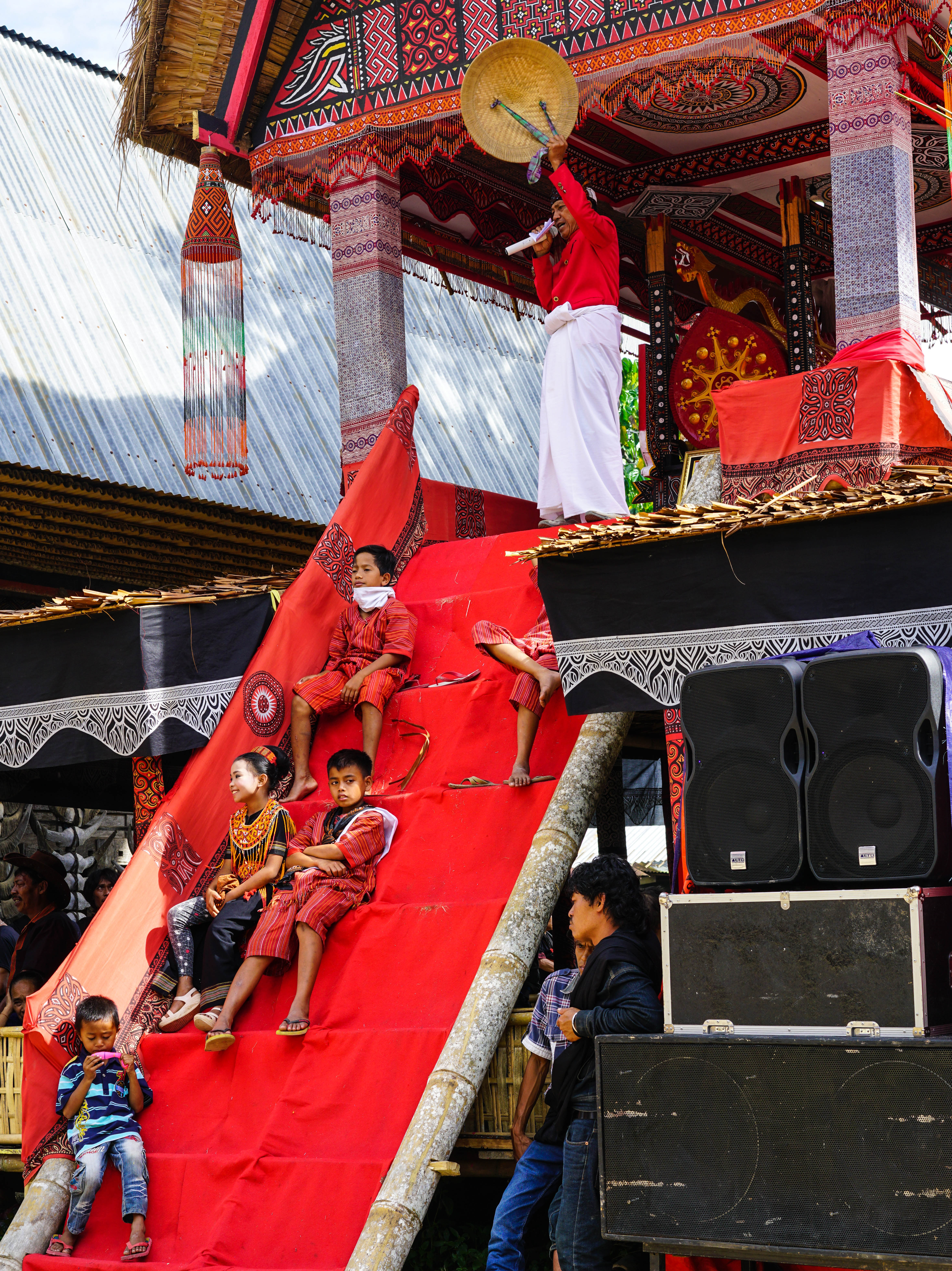 When the parade returned to the main ceremony area, the coffin was violently shaken by jumping and singing men and hauled onto a podium where the master of ceremonies gave a traditional sermon while holding the hat of the deceased. Take a look at this short video clip to get an idea: