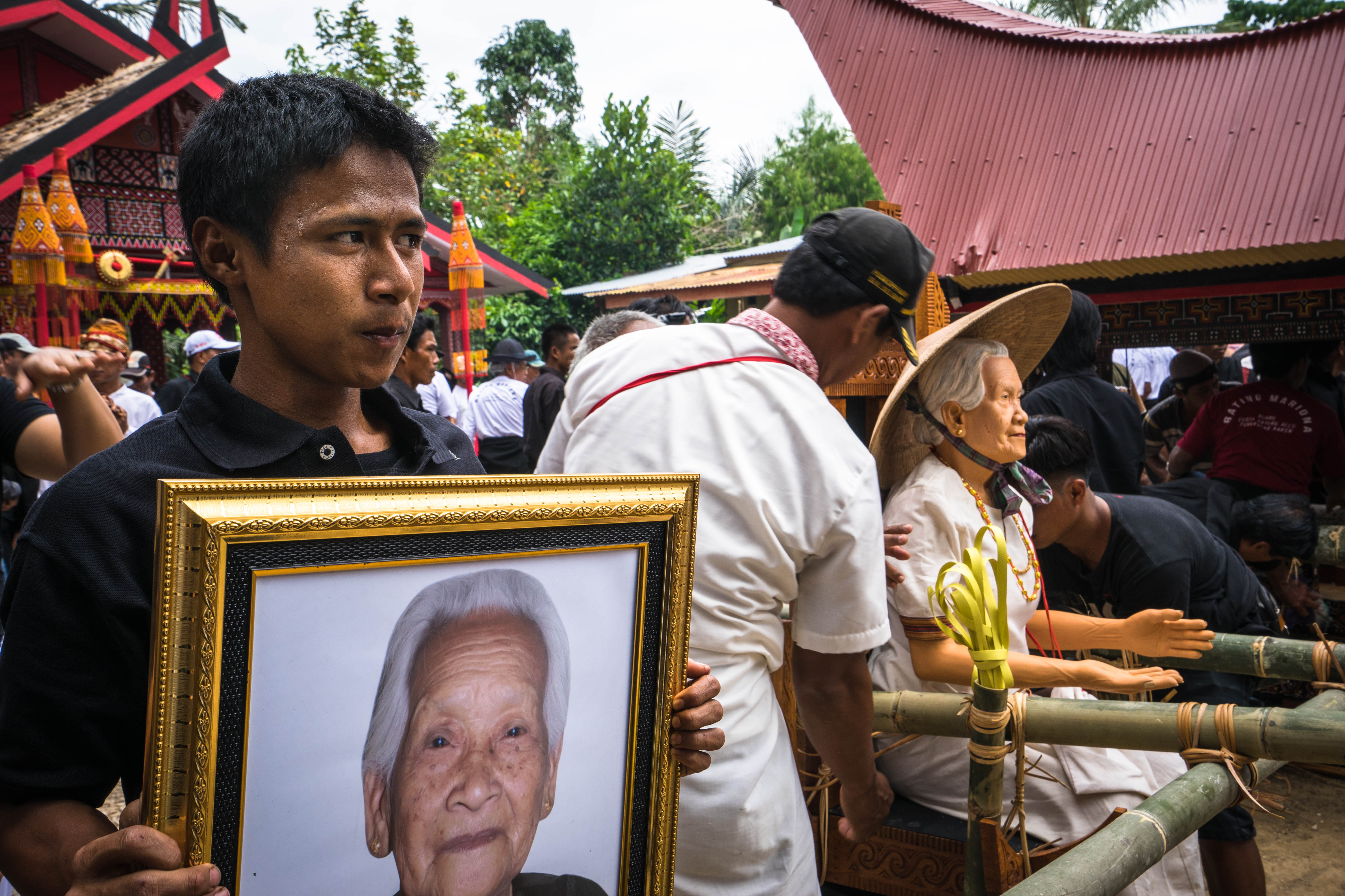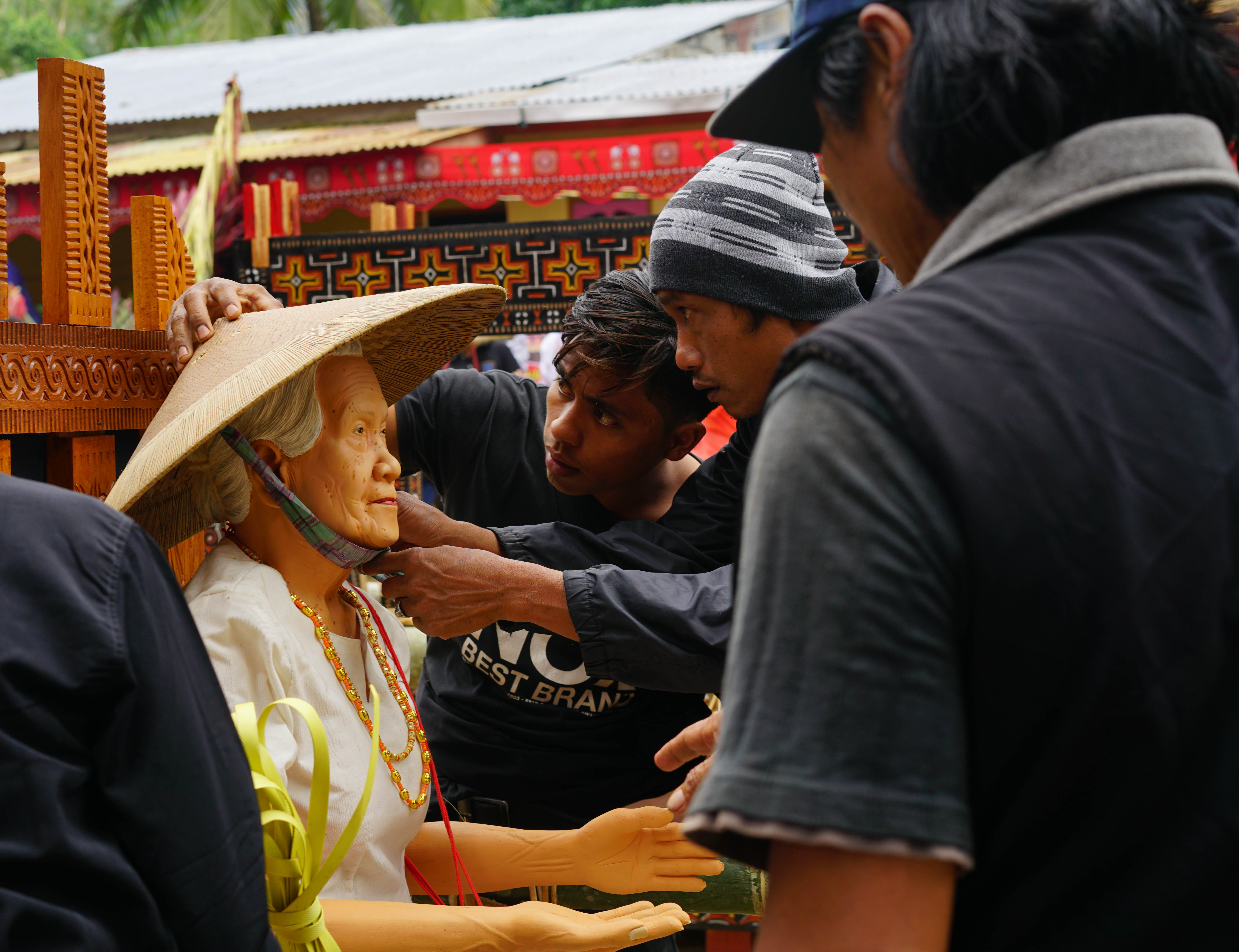 Just after lunch the coffin was to be paraded, together with the effigy and the portrait, through the village, through the rice fields. The effigy was meticulously tied onto a portable chair and her hat carefully put in place.