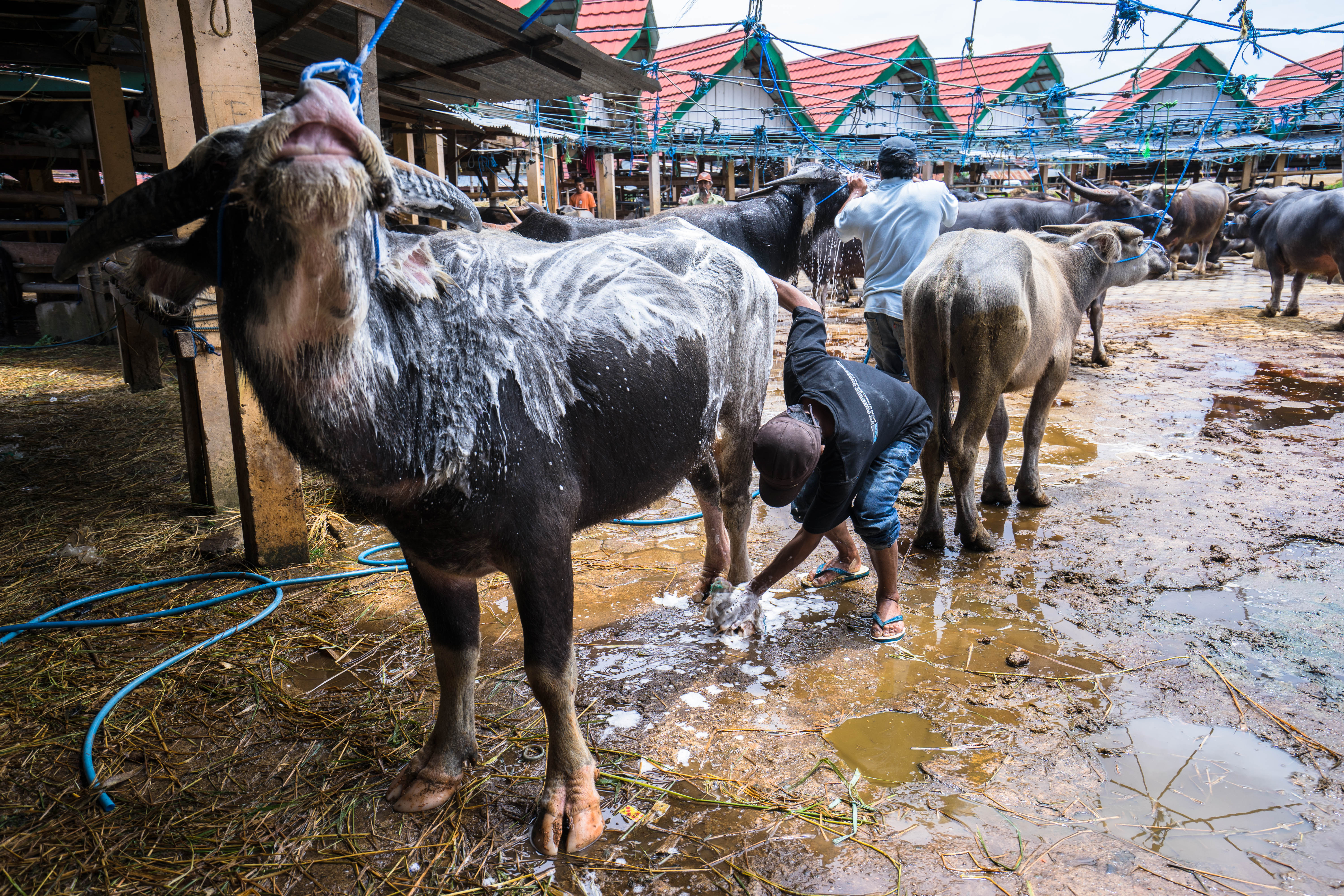 In the livestock market the buffaloes are bathed and scrubbed, from horn to hoof. Their horns are polished with lemon. Their appearance is important for their value on the market: they must look attractive to potential buyers! My driver, who had a great sense of humour, called the market “buffalo spa”. And indeed the buffaloes seemed to love their thorough cleaning ritual just as much as I love going to a spa.