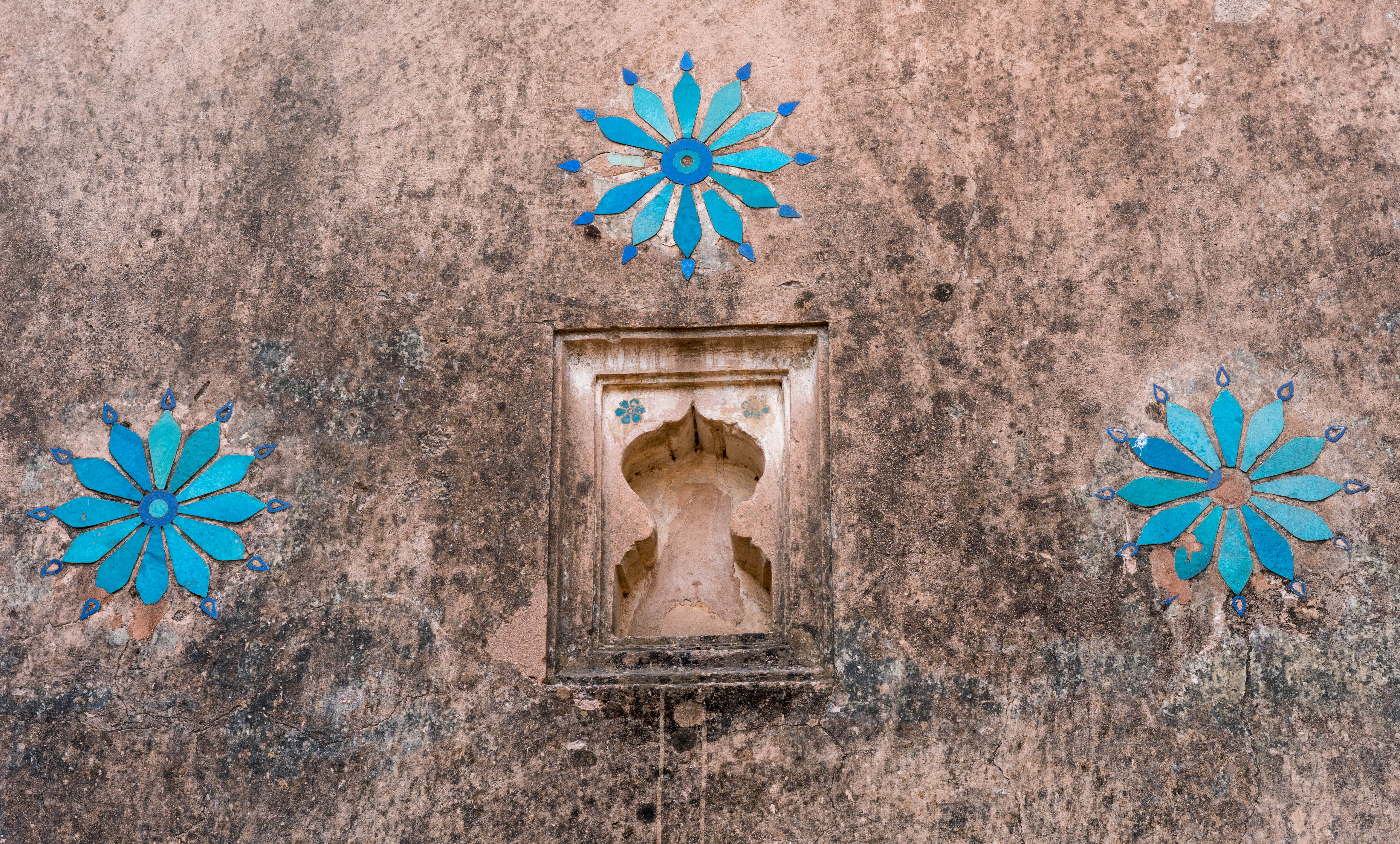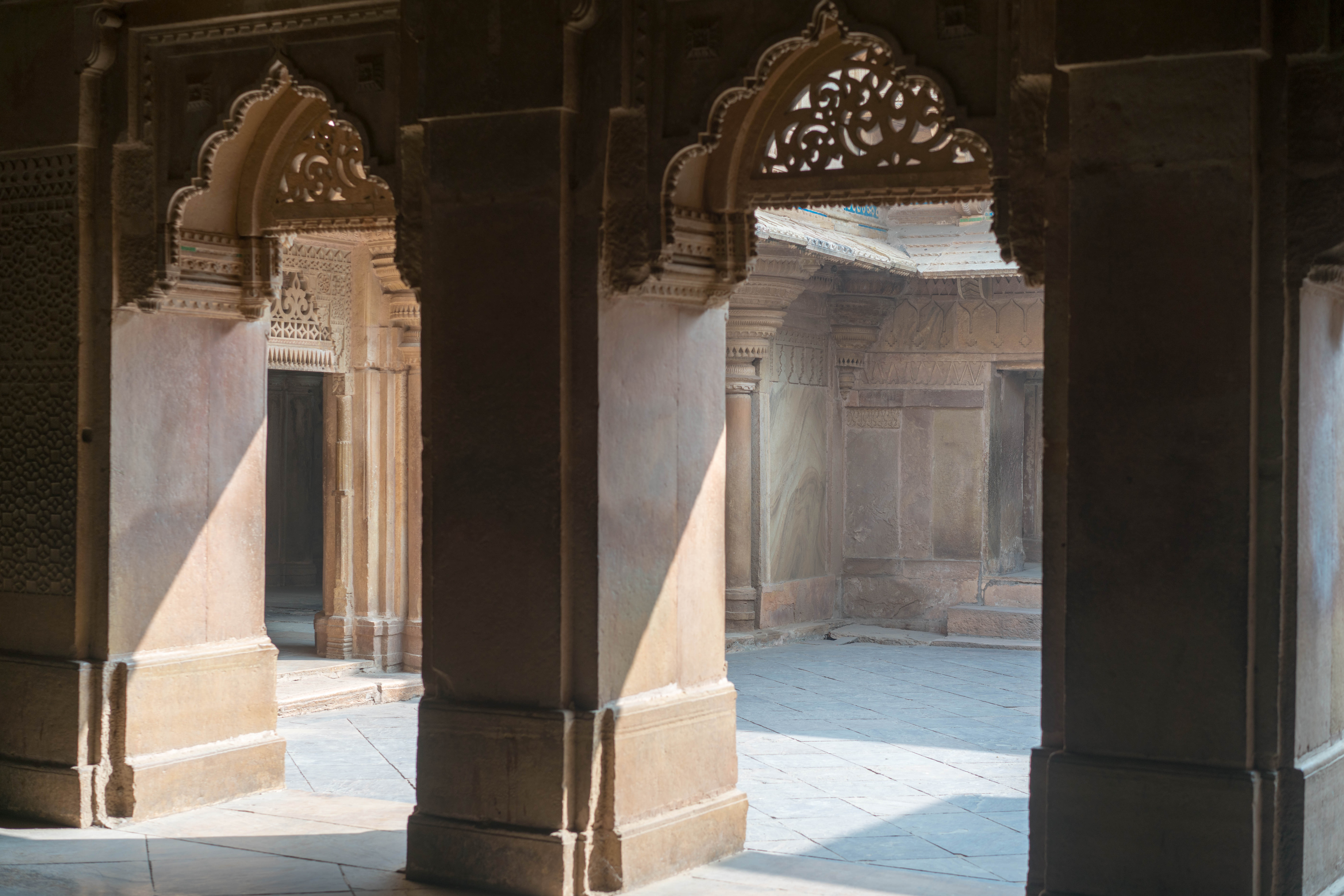 In the early morning in Gwalior, Madhya Pradesh, the majestic abandoned palace towering above the city was empty except for some bats that inhabited the lower floors. I quite enjoyed having the gorgeous palace almost to myself (I didn’t mind the bats). It has been restored, but perhaps not fully to its former glory: the guide pointed out that there were some embarrassing mistakes in the number of legs of some creatures on the outer walls.