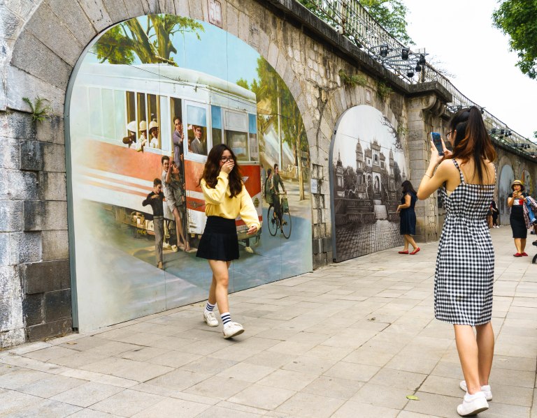 The reason for this photographic excitement and general delight is street art, a recent joint project between Vietnam and Korea, I learned. The walls between the railway arches have been turned into colourful murals, many of which are trompe l’oeil, that depict scenes from old times in Hanoi and Vietnam.