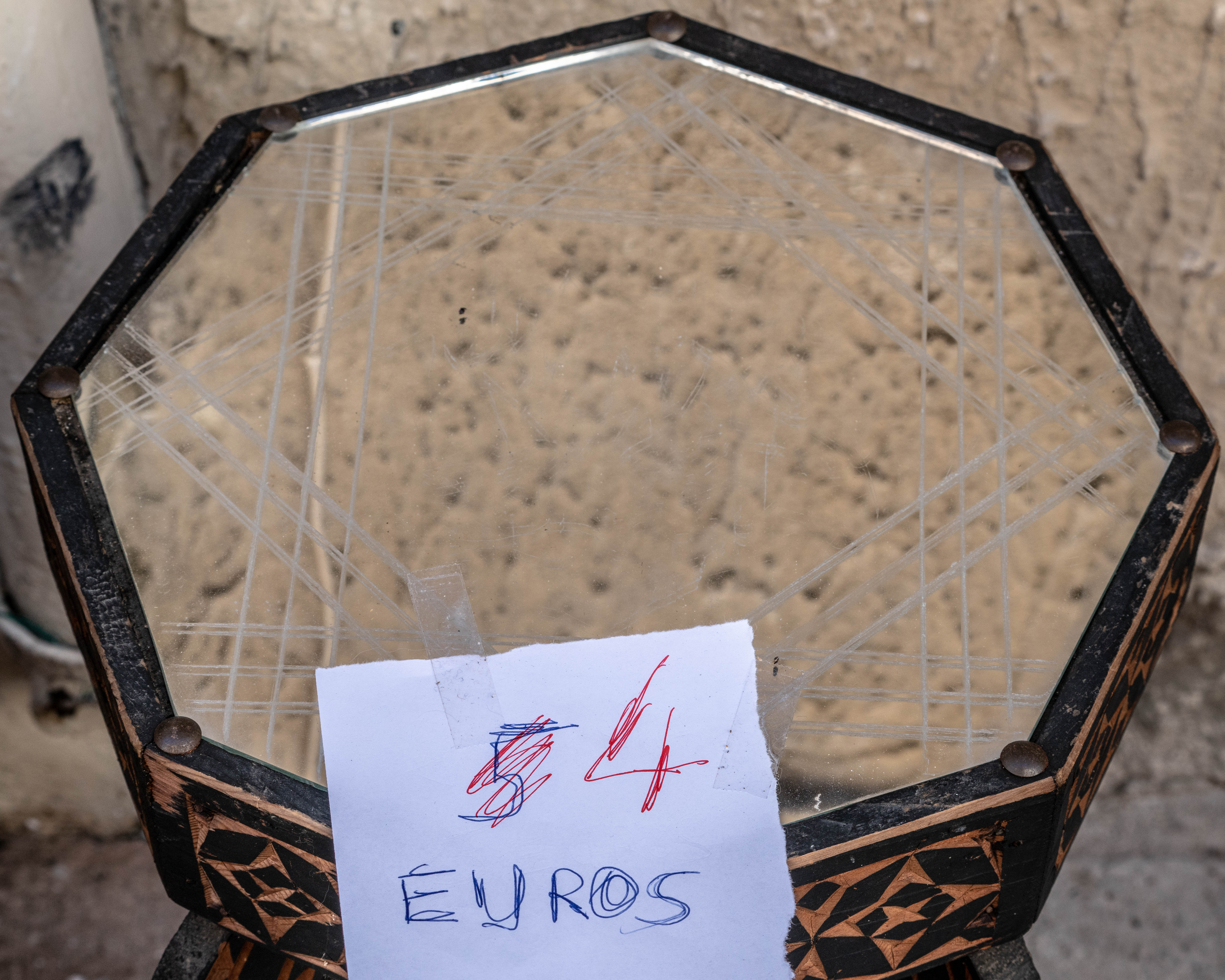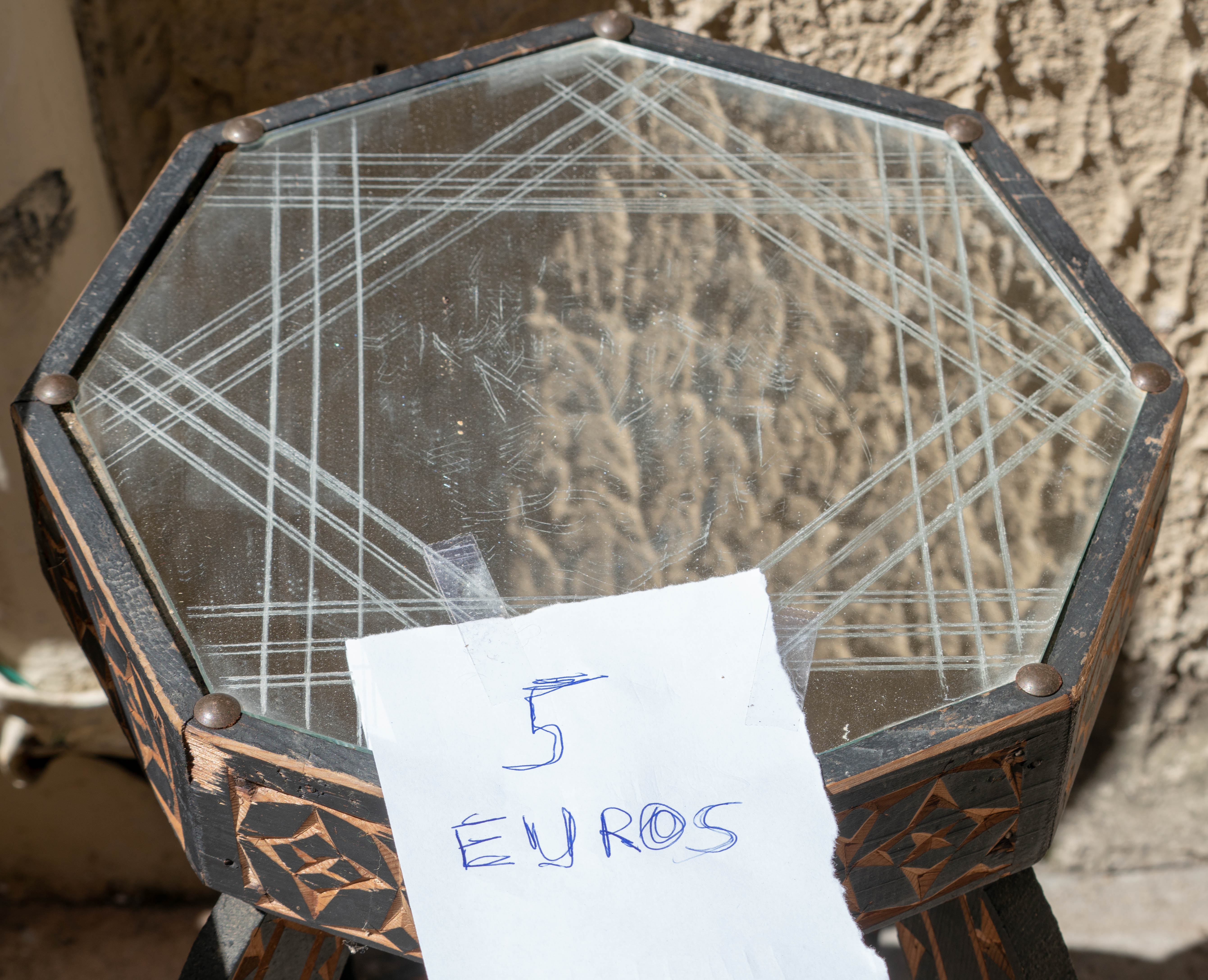 Among all the thousands of things for sale my eyes fell on a small table which could be mine for 5 euros. Hmmm. Needed some reflection. When I came back a little later the price had gone down.