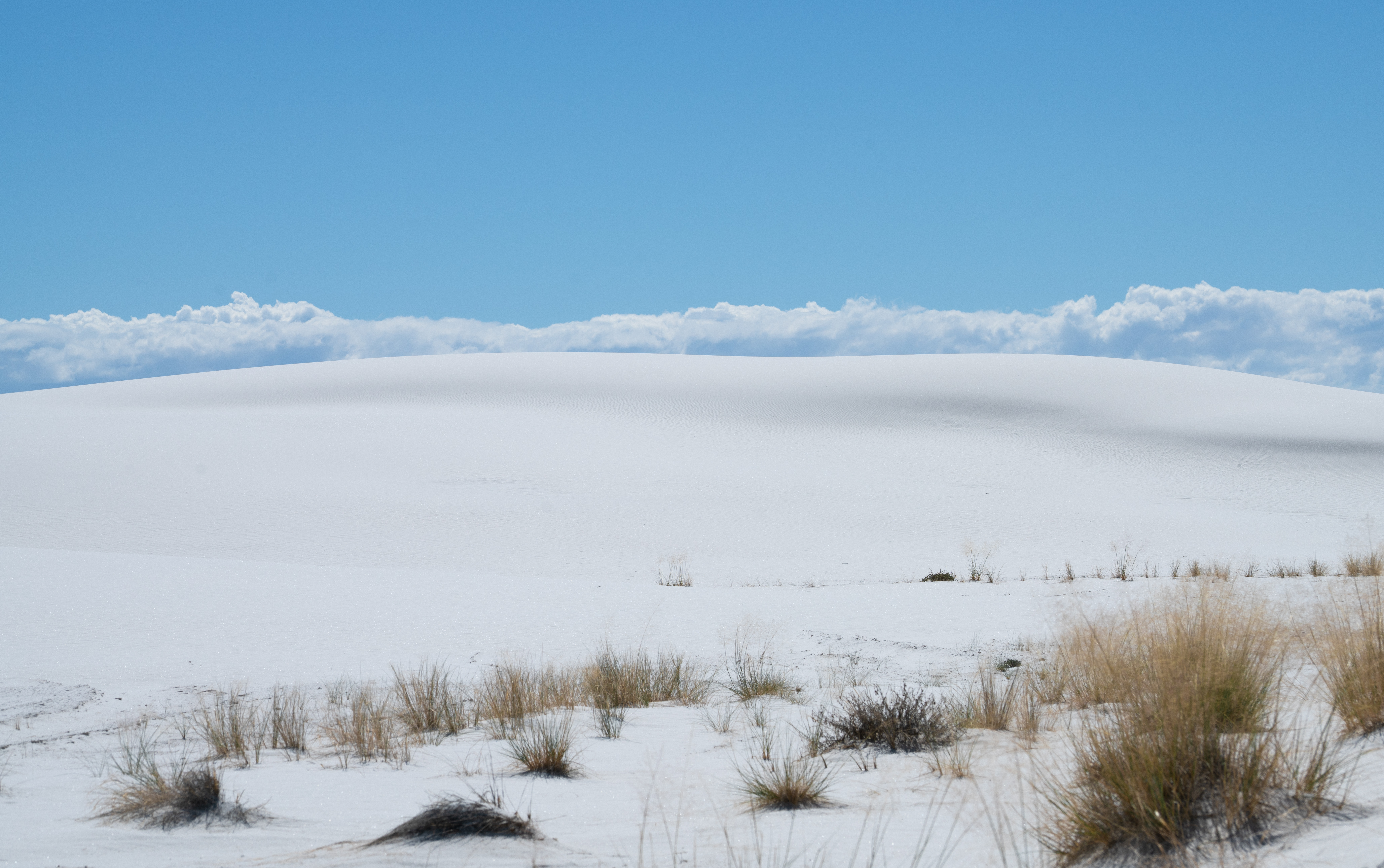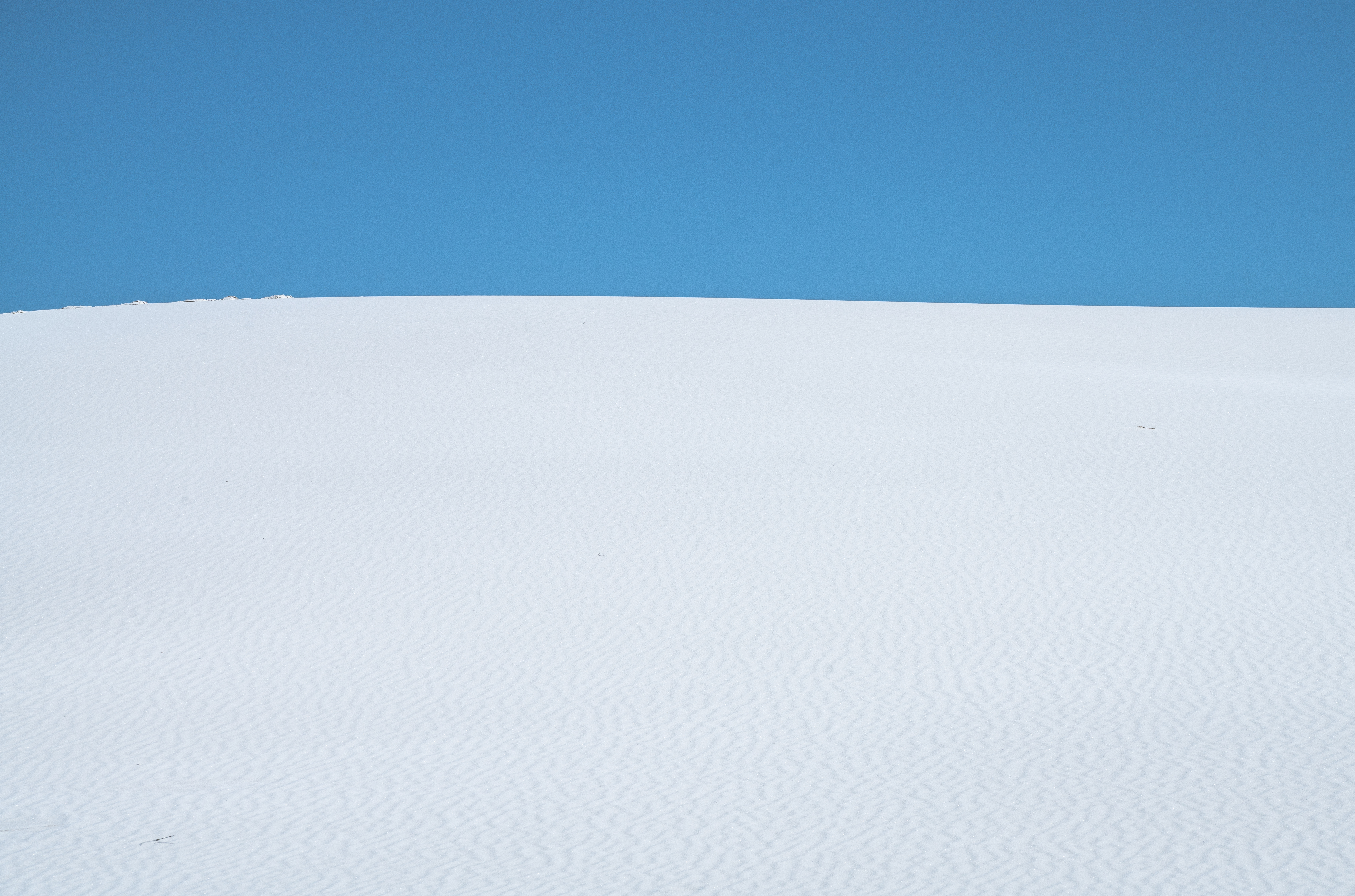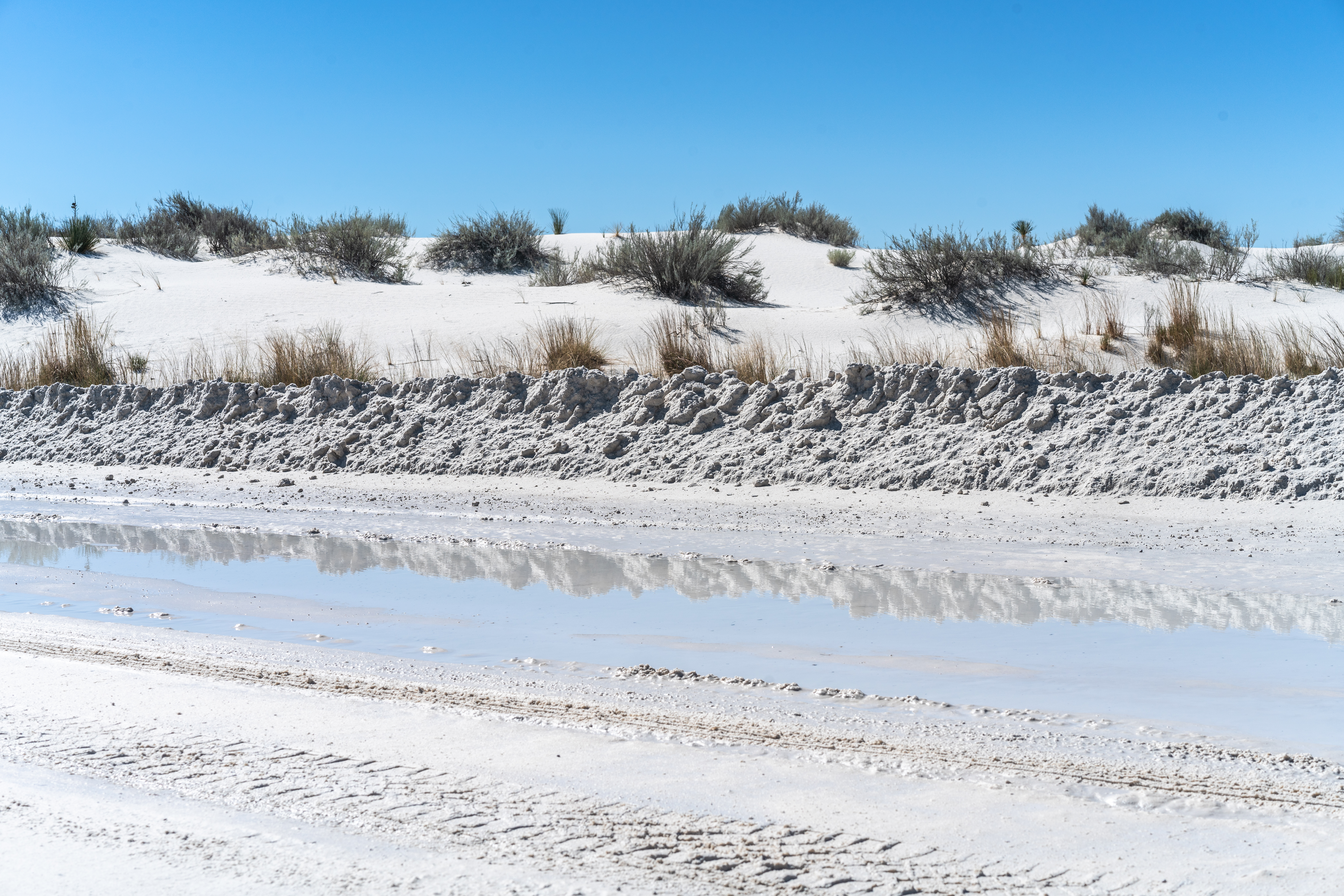 But it wasn’t snow, it was gypsum and I was in the biggest gypsum desert there is, the White Sands National Monument in New Mexico, USA. Since gypsum isn’t known to melt in the sun, the water on the road had come from above: there had been some rather heavy rain showers on the previous day.