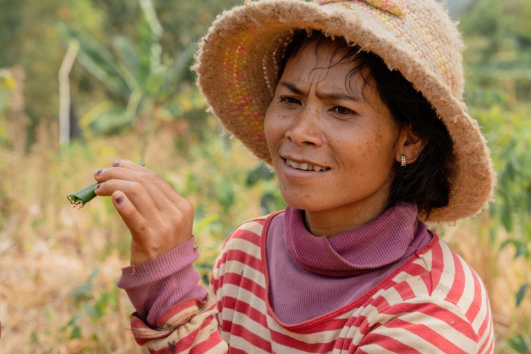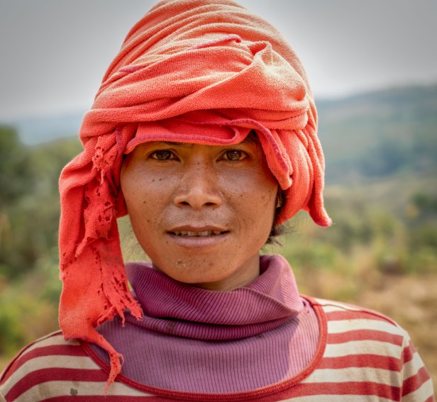 We didn’t have to drive far from the province capital of Sen Monorom to reach their small village. It seemed totally empty except for some pigs, but a young girl emerged from around a corner and from her we learned that everyone was out working. She showed us the way down a path towards the rice fields and the first one we saw there was one of Len’s friends.