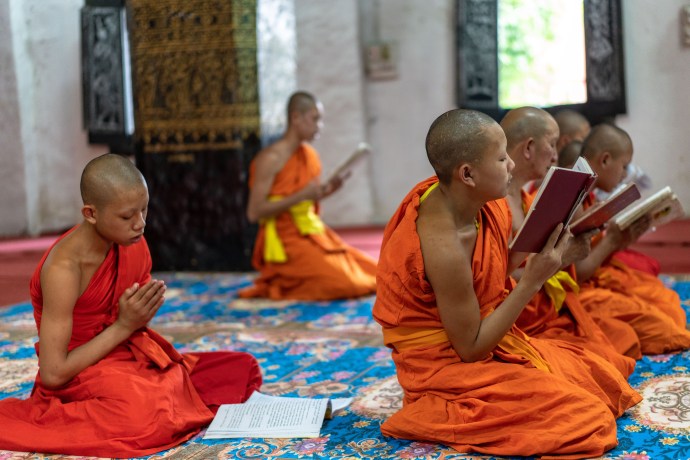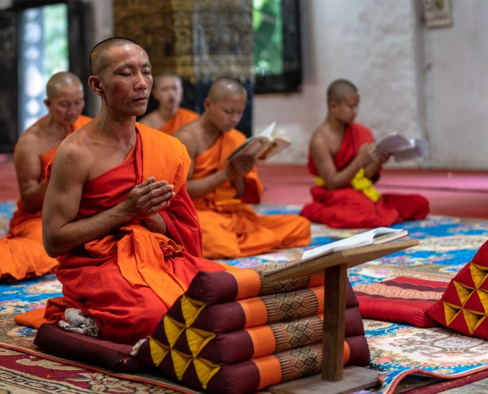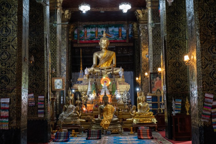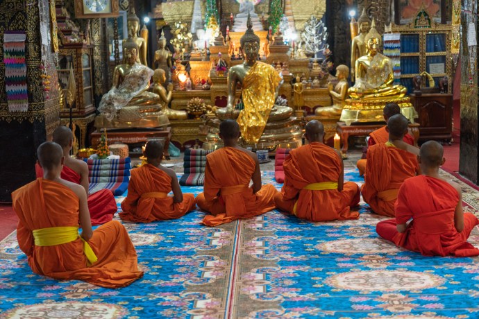 Just opposite the hotel there was a small temple. My guide Phak had been a novice himself in a Luang Prabang temple for two years, and knew all about daily schedules and monastic life. Not feeling like heading into town, I asked him if I could attend the evening chanting. He went inside to find someone to ask, and came back with a positive reply: I was most welcome, and I should be there just before 6 pm.