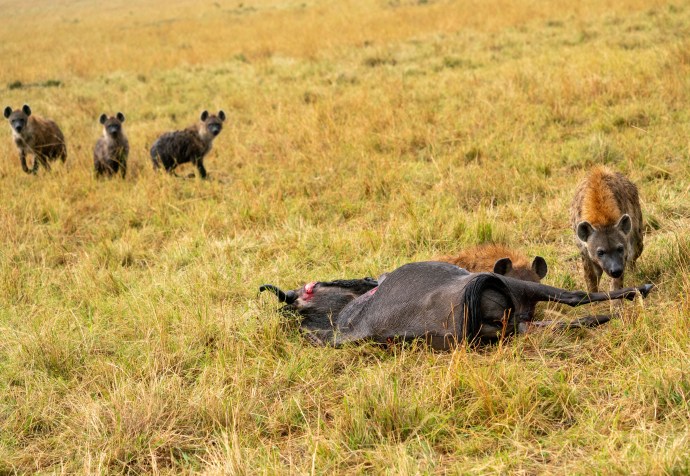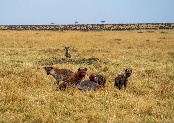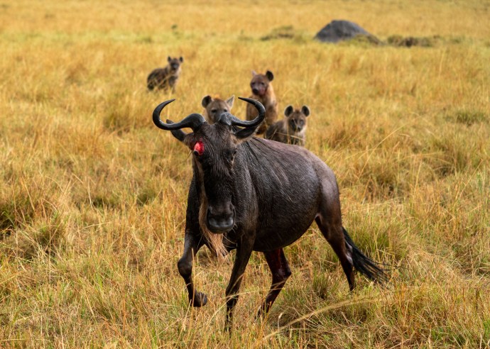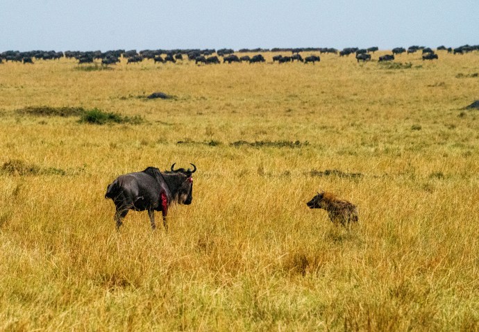 But this gnu wasn’t any gnu, it was one that didn’t easily give up. It kicked away its attackers and stood up, bleeding from an eye, from its stomach and from its leg. What a will to live! It bravely stood eye to eye with the hyenas, who cautiously backed off for a moment.
