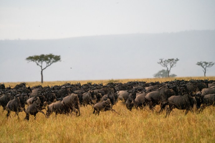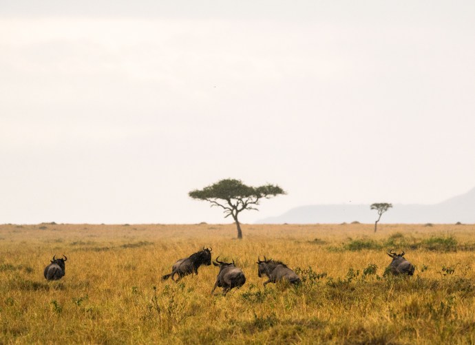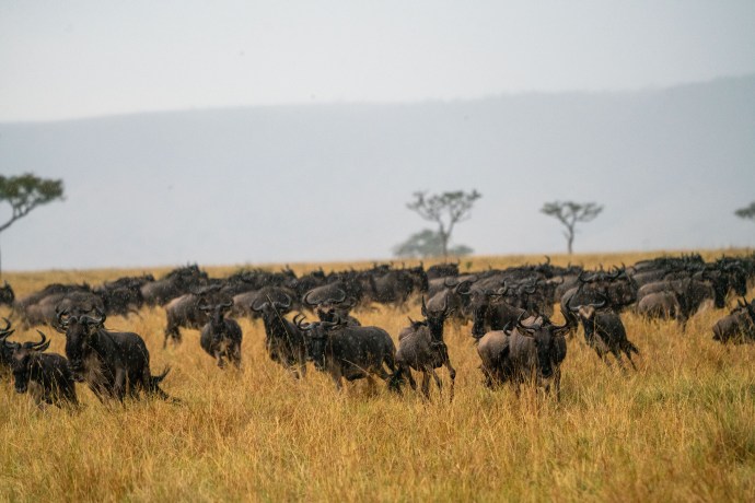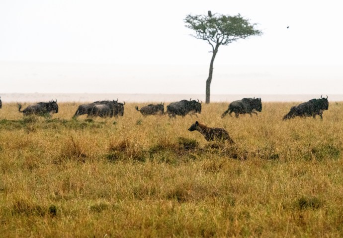 Thousands of gnus were running around like crazy, in all directions, abruptly changing direction, overtaking one another, running even faster – it looked like a mad dance. It was a very wet late afternoon on the savannah in the Mara Triangle, Kenya. A thunderstorm had passed but the air still was electric. And the gnus felt it.