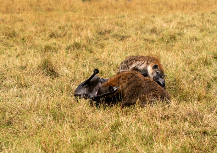 Before I knew, the hyena on the left had attacked a gnu that had become isolated from the rest and had it on the ground. The gnu was still alive, the hyenas were biting, gnawing and chewing, it was cruel to witness.
