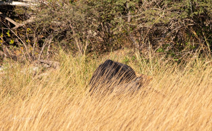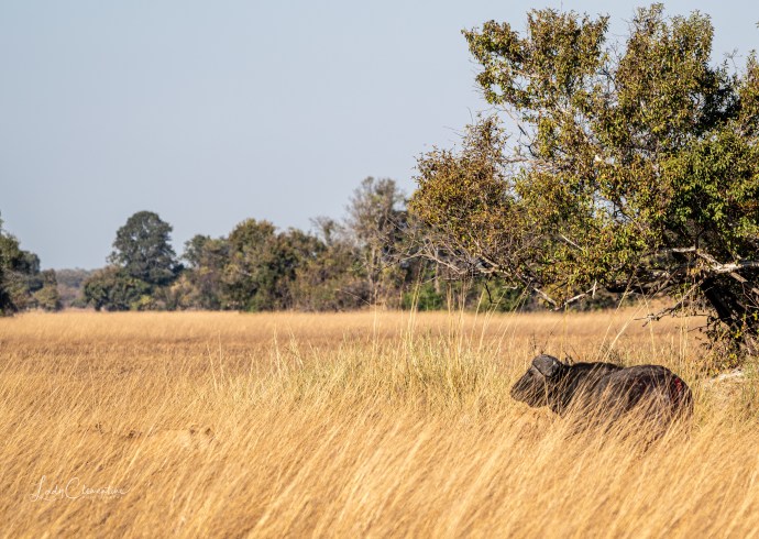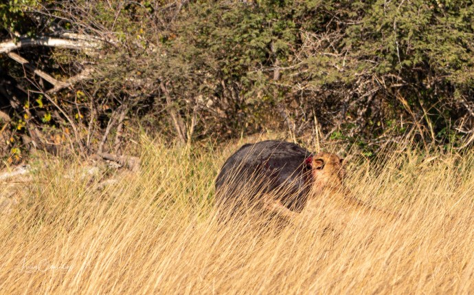 Where were all the animals?? It was a very calm morning, quite chilly, in the Busanga Plains in the Kafue National Park, Zambia. We saw some birds, passed the odd grazing antelope, but the usual numbers just weren’t there. In the distance there was a lone buffalo (actually the first we had seen up in Busanga), but wait! There is something strange, the buffalo is sort of dancing and … there is something on it, something yellowish – a lion!!!