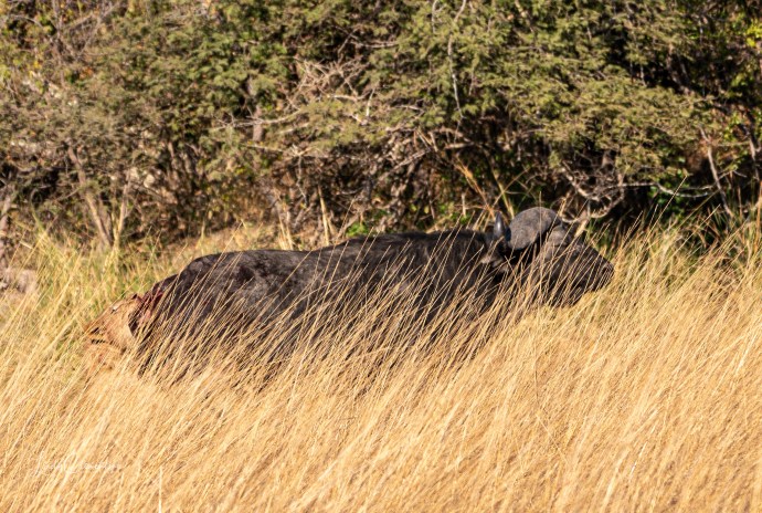 We finished our coffee, the stand-off continued, the lions slowly seemed to give up, albeit it hesitantly, the buffalo was just waiting for the lions to drop off, and we decided to leave the scene.