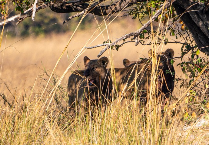 The lions seemed a bit overwhelmed, there was no more display of force. Instead it all came to a stand-off: some of the lions parked themselves in the grass in front of the buffalo (can you spot them?):